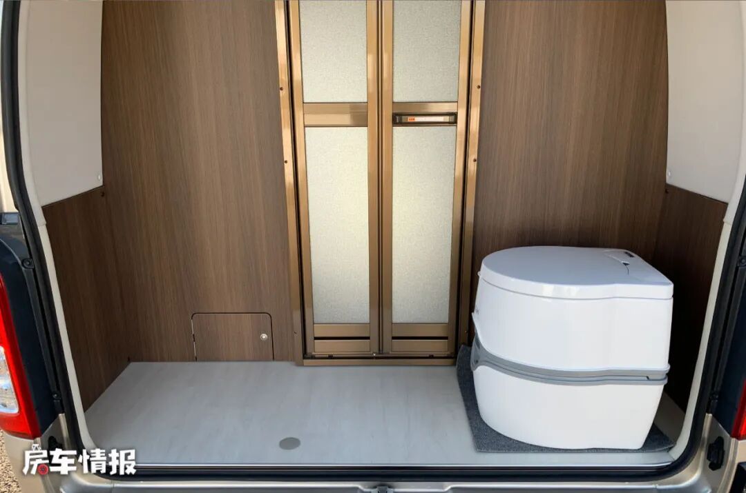 车厢尾部用推拉折叠门做了格挡处理,提供了一个便携式马桶,地板上留有下水口,如果后期有所需要,也可以自己加装淋浴设施。