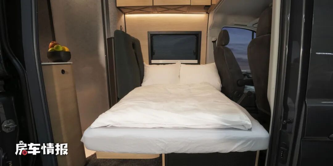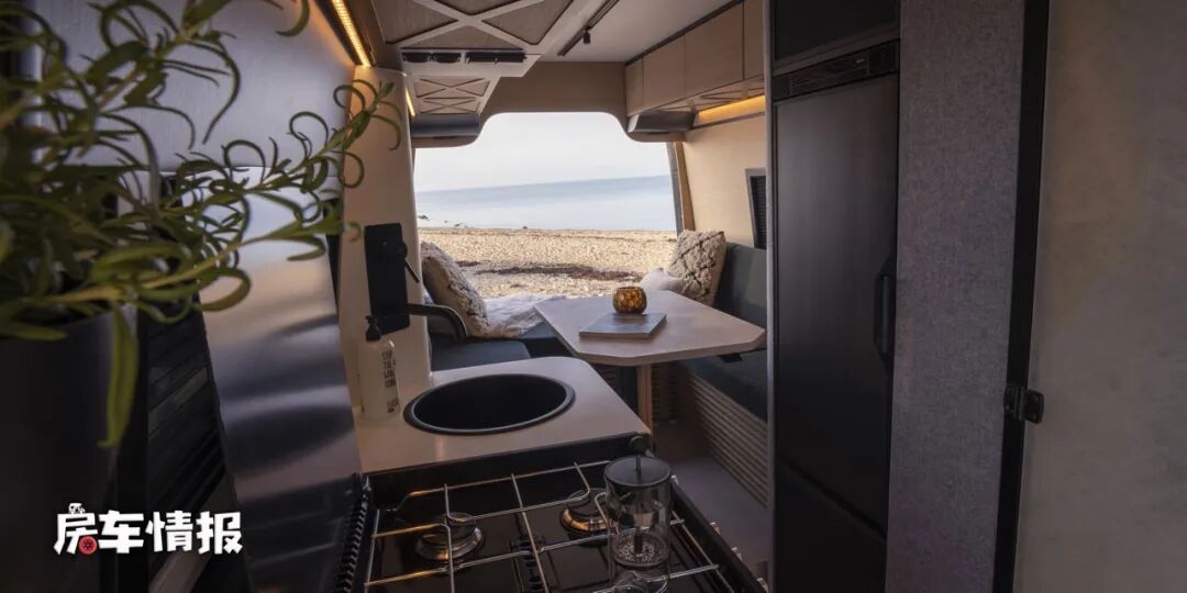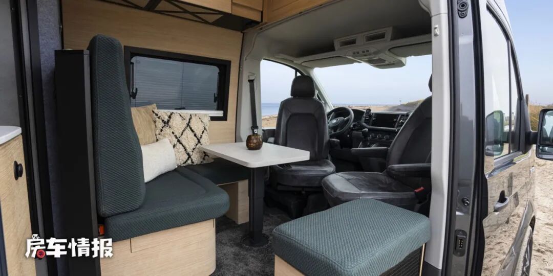 众所周知,一般的房车只设计了一个餐厅,但是这款房车在车厢的尾部还设计了一个带折叠沙发的餐厅,白天的时候既可以选择户外用餐,也可以在关门的情况下享受更私人的用餐体验。晚上降下餐桌,就可以与沙发搭建成一个休息区,变成1750 x 1950(mm)的纵向双人床,两个成年睡觉休息时绝对没有问题的。