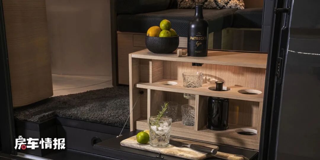 门口处设置了一个迷你吧台,将外面板向下折叠,露出一个可容纳两个酒瓶和四个杯子的储物木柜。面板翻折下来还可以充当小桌台,并且提供了照明和USB充电接口,设计非常的人性化。