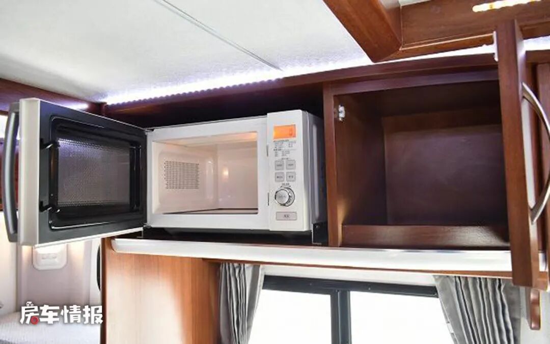 厨台侧面暗藏了一台小型的冰箱,厨台的下方提供了多个储物柜,空间也还不错,上方则镶嵌了一台微波炉。
