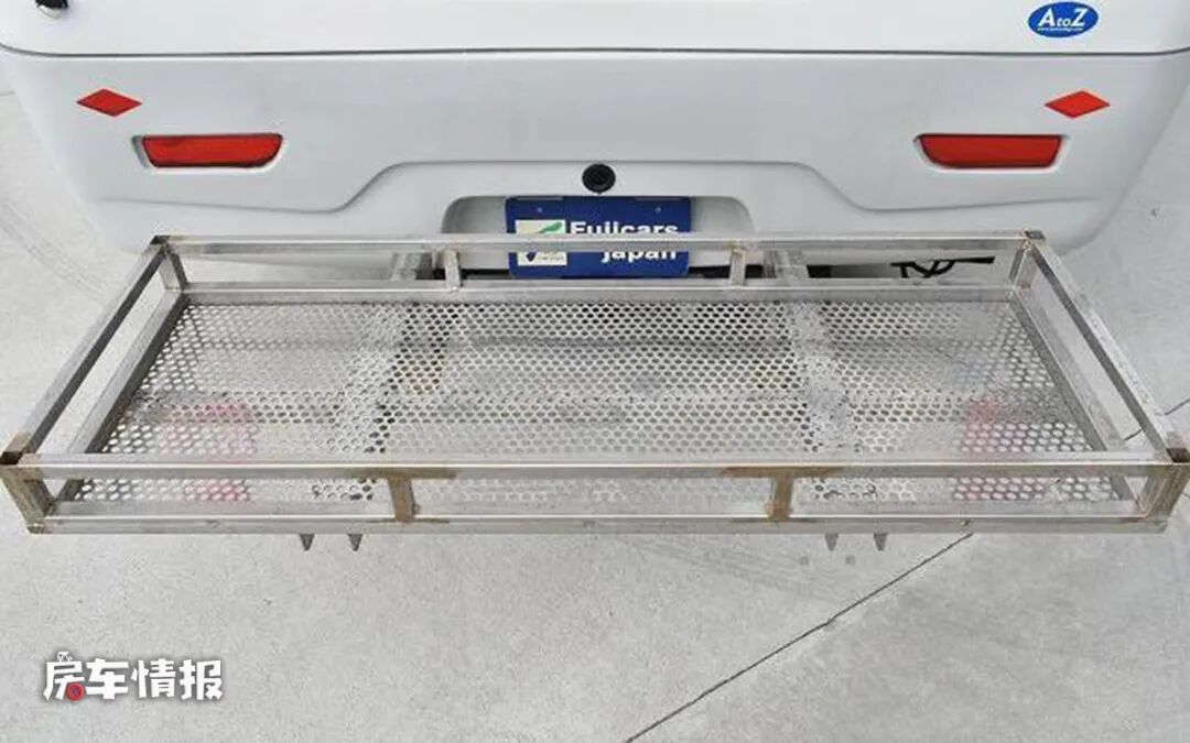 车身左侧上方提供了一个手动的遮阳棚,下方提供了大号的行李舱,与众不同的是在车尾部加入了一个铁艺的折叠置物架。