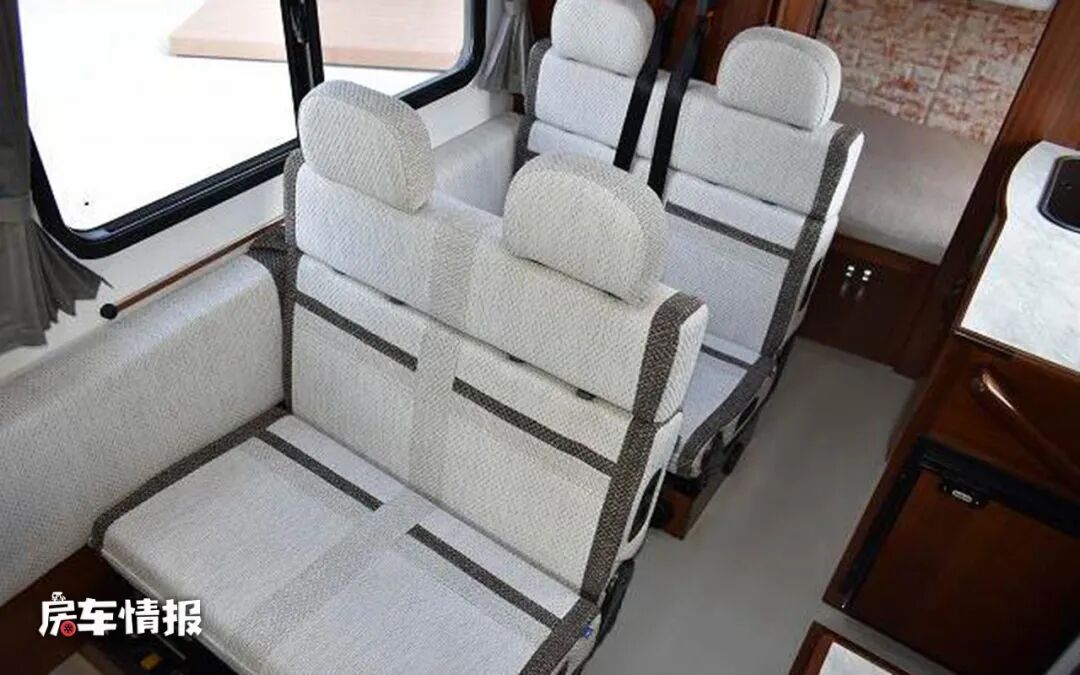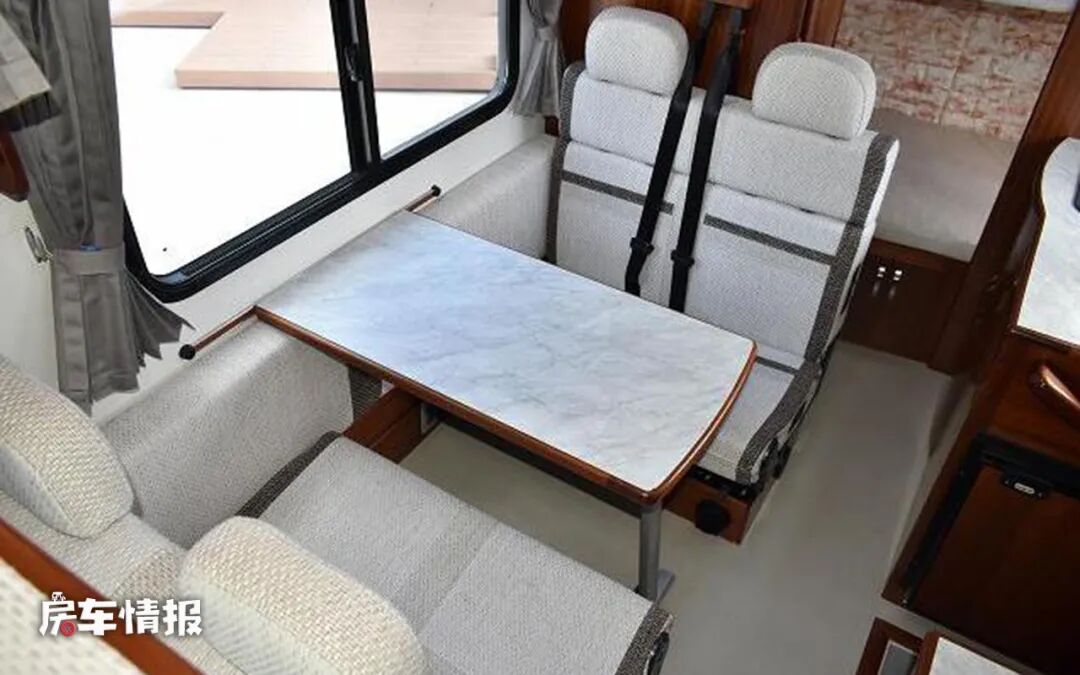 主驾驶座椅后方是全车的会客区,由两排对坐沙发和一张可移动的大尺寸餐桌组成,面向前方的两个座椅还提供了安全带,除此之外所有的沙发座椅都配备了头枕,可以缓解行车过程中的疲顿。除此之外,前排座椅也加入了可旋转功能。