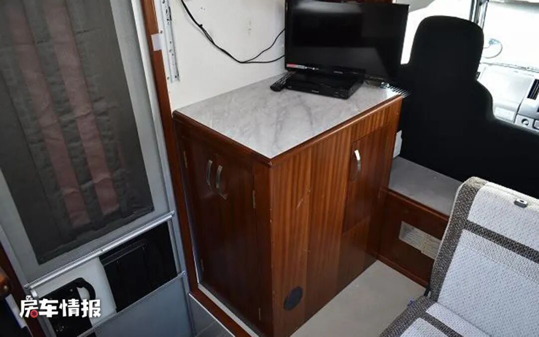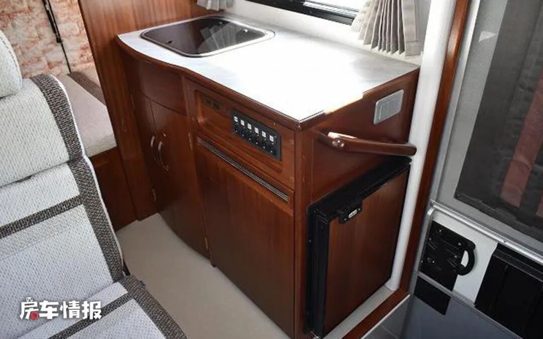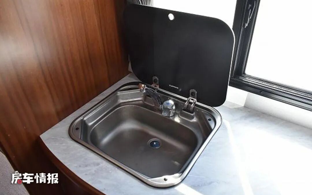 乘客门后侧是全车的厨房区,厨台的面积还不错,但是只提供了一个带盖的洗菜池,没有提供电磁炉。