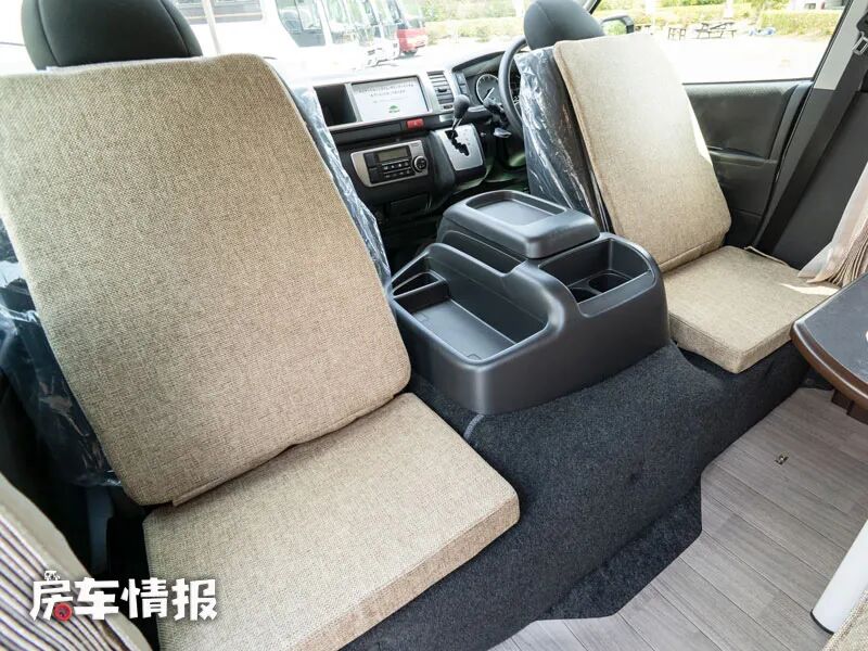 驾驶室后方是会客区,这款房车采用了一个特别有意思的设计,因为前方驾驶室的两个座椅不带有旋转功能,所以在驾驶室后方设计另一个软塌,上面配有两个坐垫,当需要中途休息时,可以将主副驾驶座椅向前倾斜,这样后方的坐垫就有了一个较为舒适的乘坐角度。