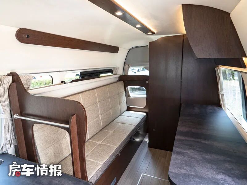 从车身左侧的乘客门进入车厢内部,家具全部采用胡桃木色,提升了整体的质感。