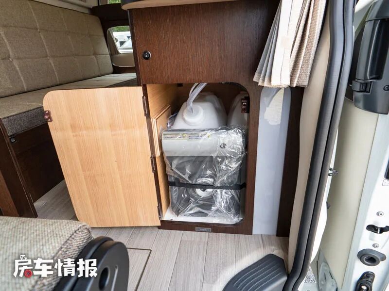 水电方面,这款房车提供了一个100Ah的副电池,水路上则提供了20L的净水箱和20L的排水箱。