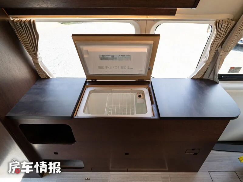 乘客门的后方是一长条的橱柜,橱柜的台面尺寸也比较宽敞,并且台面被设计成了三个可翻盖的形式,中间是一台40L顶开式冰箱,左侧桌板下方是电磁炉,右侧桌板下方则是洗菜池。总体来说配置还是比较齐全的,能够解决简单的做饭问题。