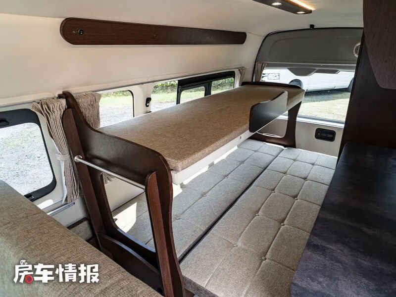 橱柜的对面是一张多功能的床,平时驻车时也可以充当沙发座椅,