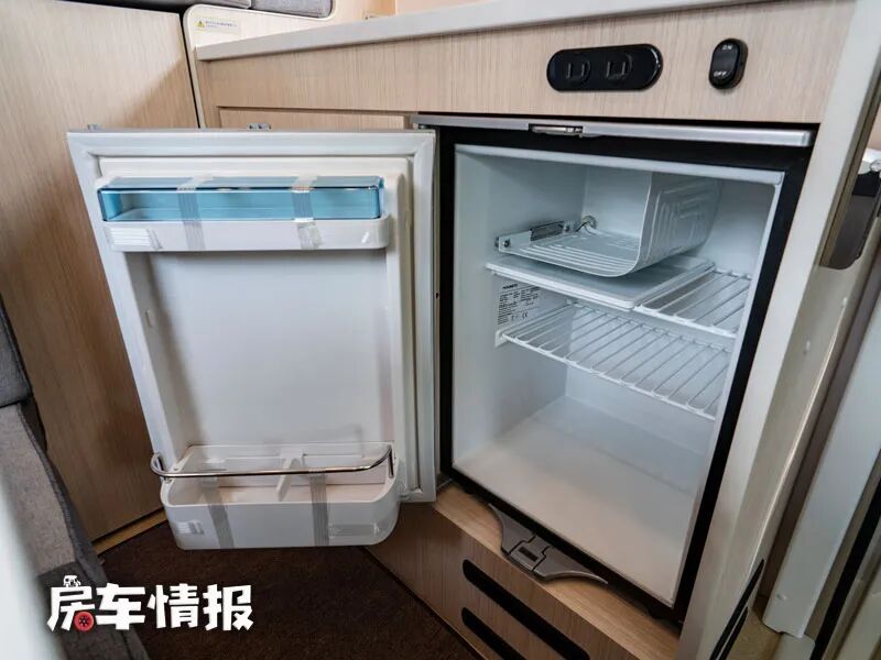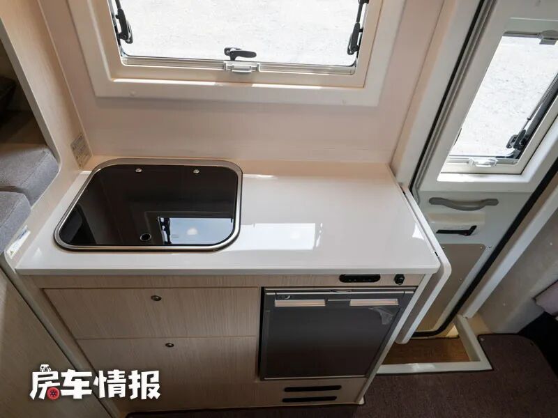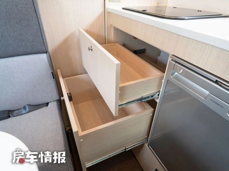 乘客门后方是厨房区,台面上只提供了一个带盖的洗菜池,同时也提供了一台可拆卸的燃气灶,下方提供了则提供了多个储物抽屉和一台40L的车载冰箱。