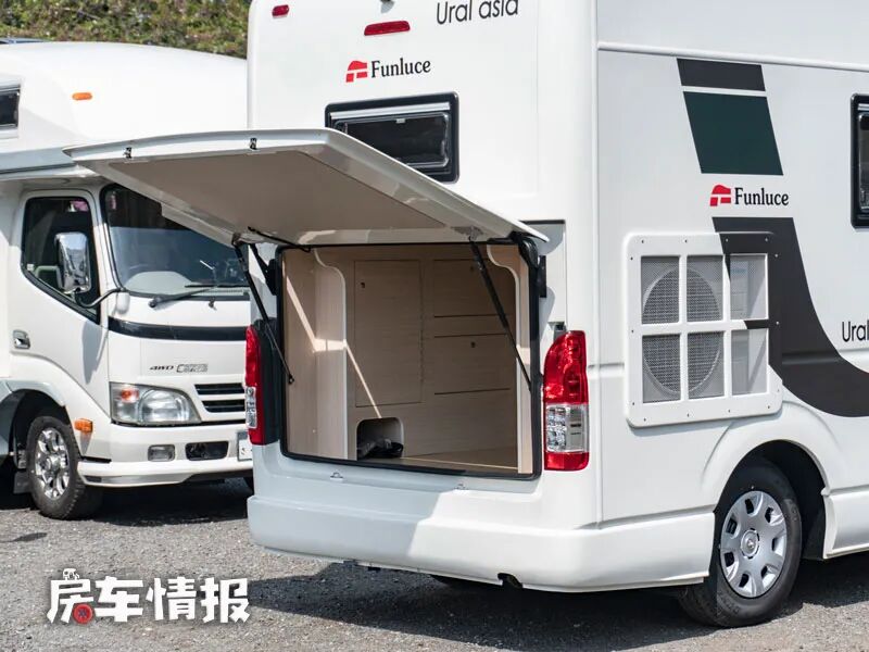 车顶的额头相较于其他车型来说更为的圆弧小巧,车尾部的尾门打开后直通内部车厢,平时可以当做行李舱使用。车身左右侧都没有过多的复杂设计,只提供了简单的水电接驳功能。