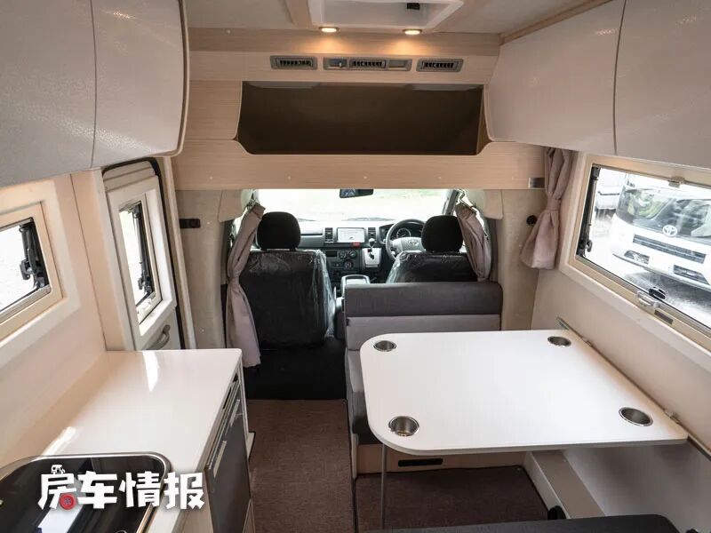 驾驶室后方靠窗的区域是全车的会客区,由两排对坐布艺沙发和一张大尺寸的可拆卸餐桌组成,虽然整车的尺寸不是很大,但是会客区的空间还是比较宽敞的,上方还提供了两个储物吊柜。