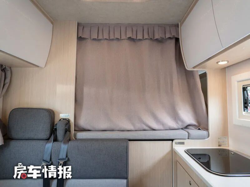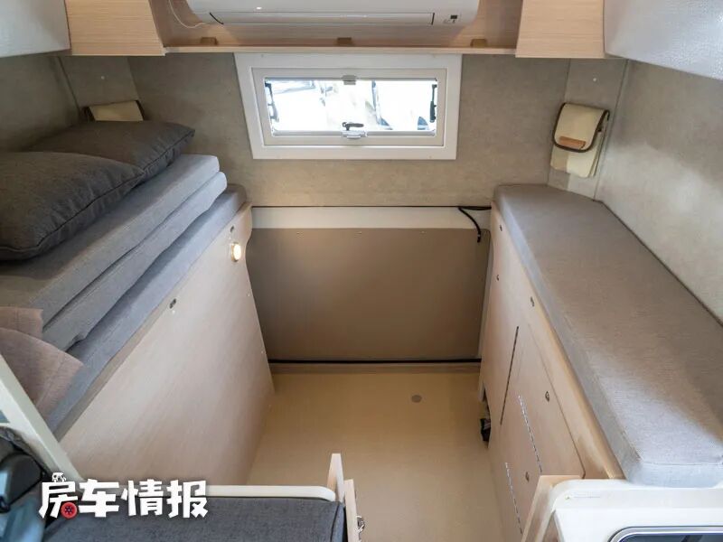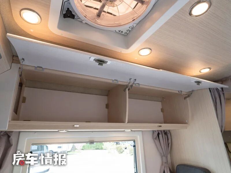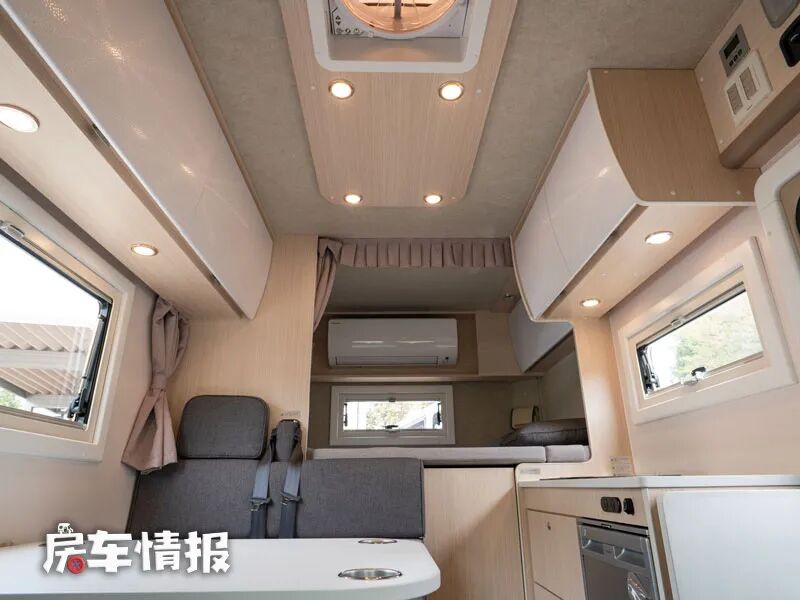 从车身左侧进入后车厢,相较于驾驶室来说,车厢后部的生活区更加现代时尚一些,以原木色为装潢主色调,搭配日光射灯,也突显了温馨感。