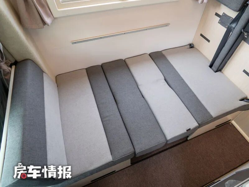 车厢尾部是全车的休息区,带有一个隐私拉帘,平时白天不需要的时候可以将床垫折叠起来,底下存放大件行李。