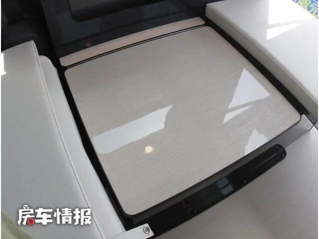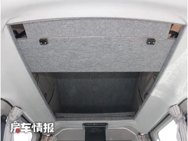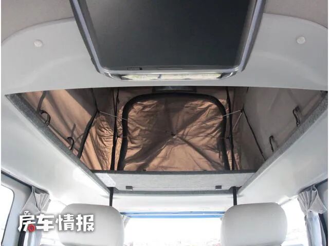 另外除去这张可转换的沙发床以外,在车顶部的升顶机构内还提供了一张双人床,所以整车最多可以为四个成年人提供休息睡觉的地方。