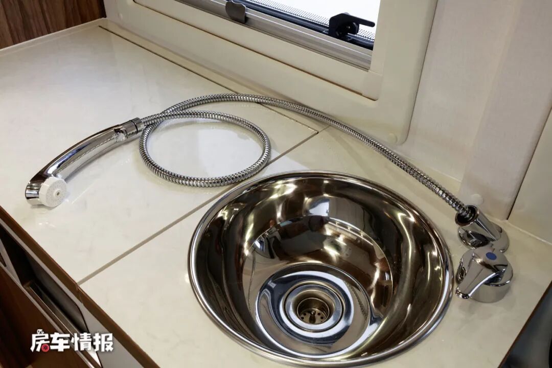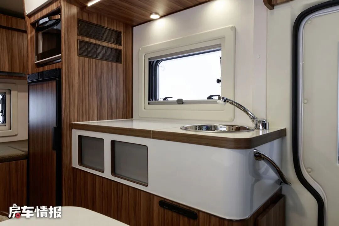 乘客门后方设立了一个厨房操作台,台面上设计了一个带有抽拉式水龙头的水盆,下面则提供了两个大号的的垃圾箱,方便进行垃圾分类,也不占用其他生活空间,非常的人性化和环保,