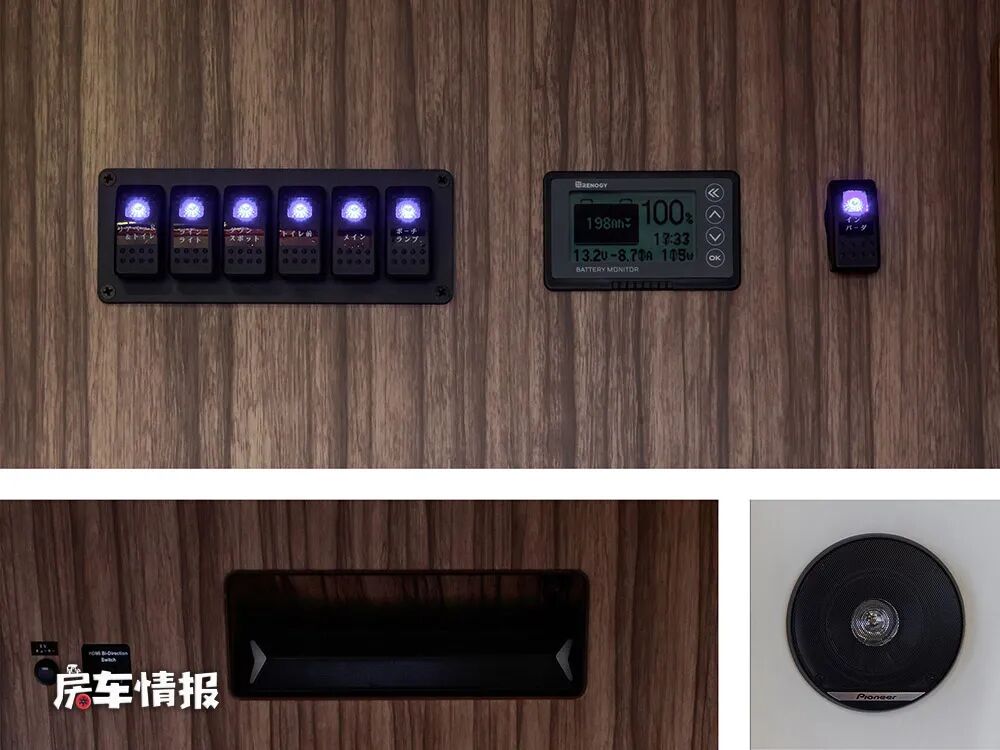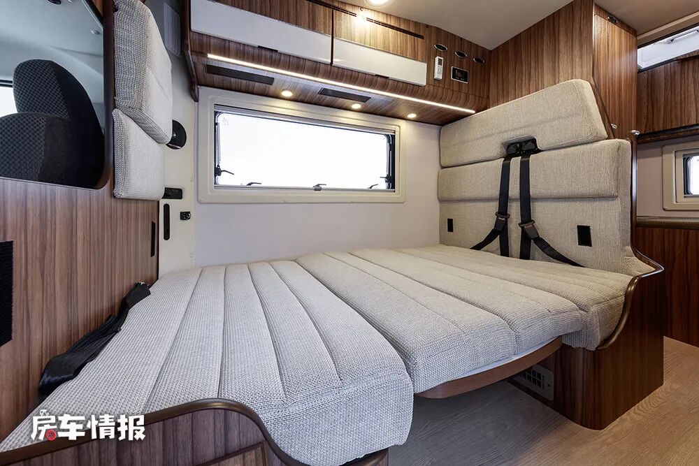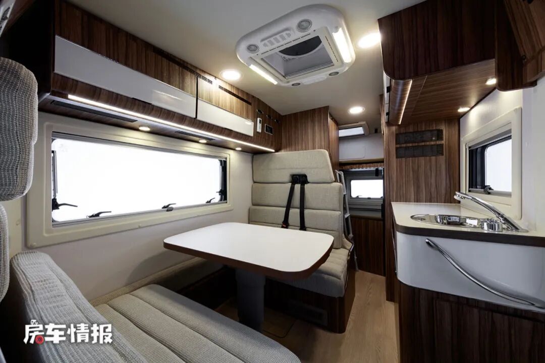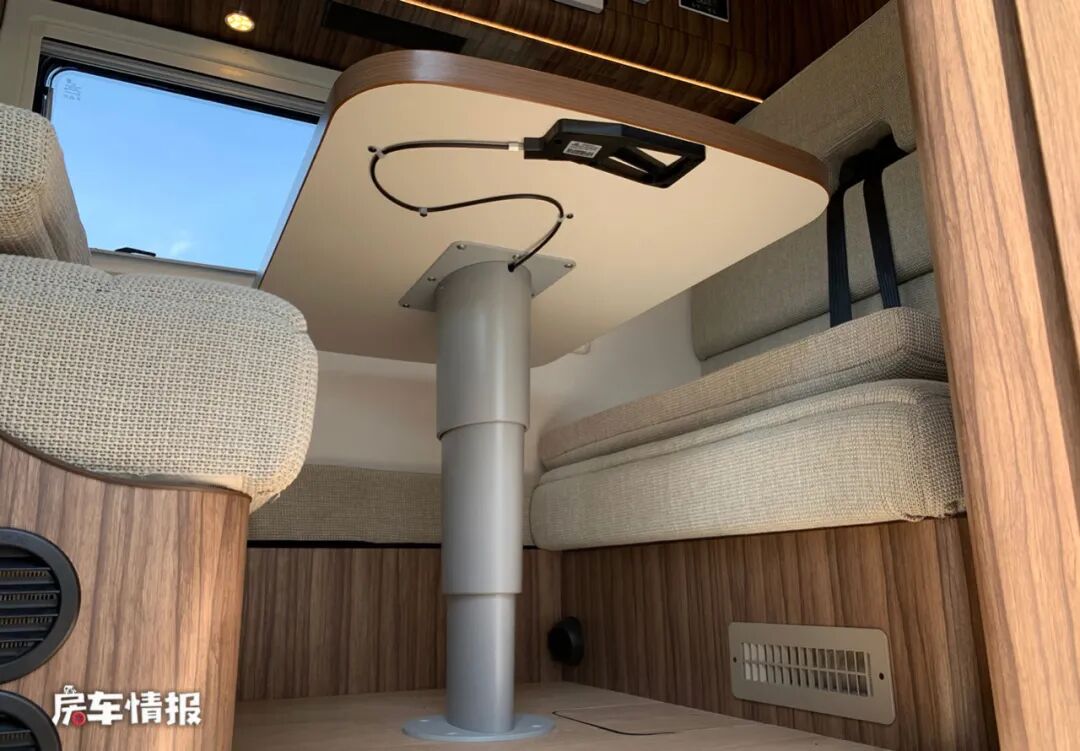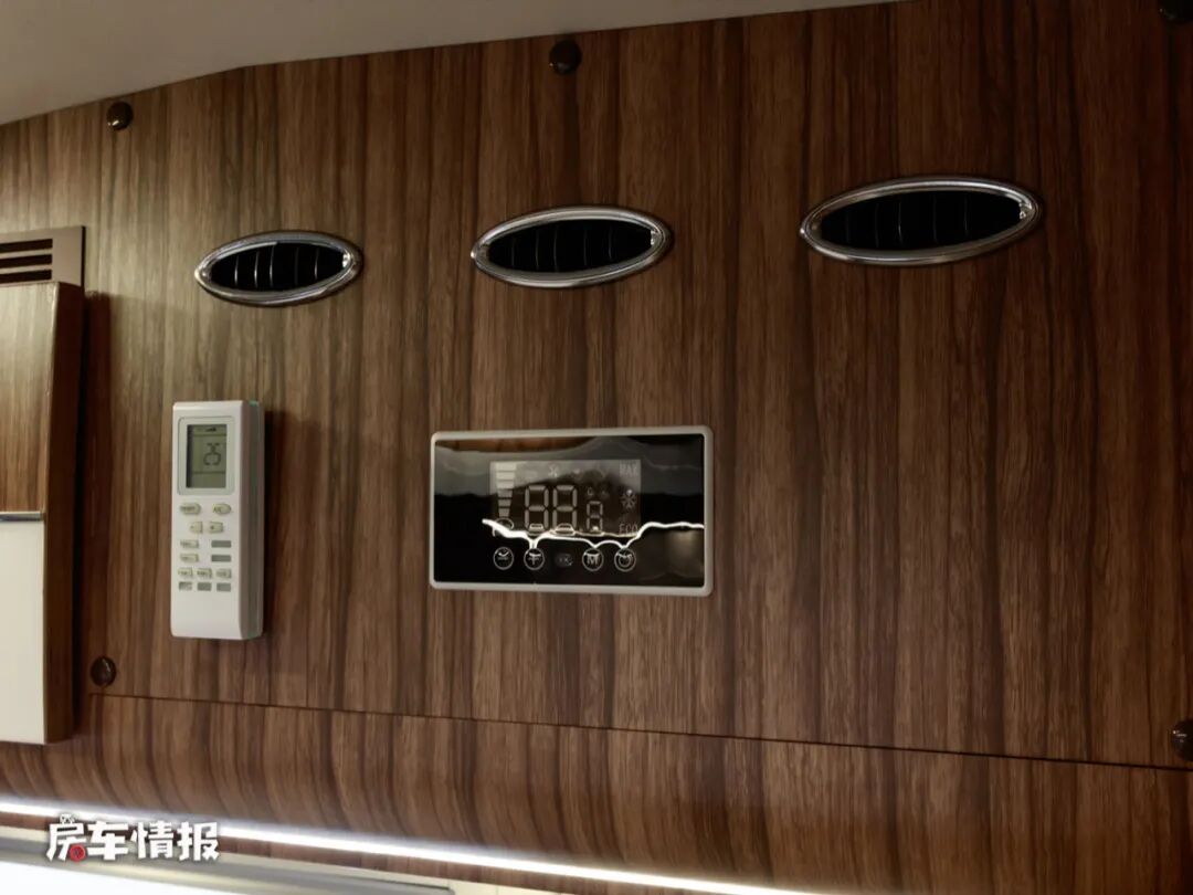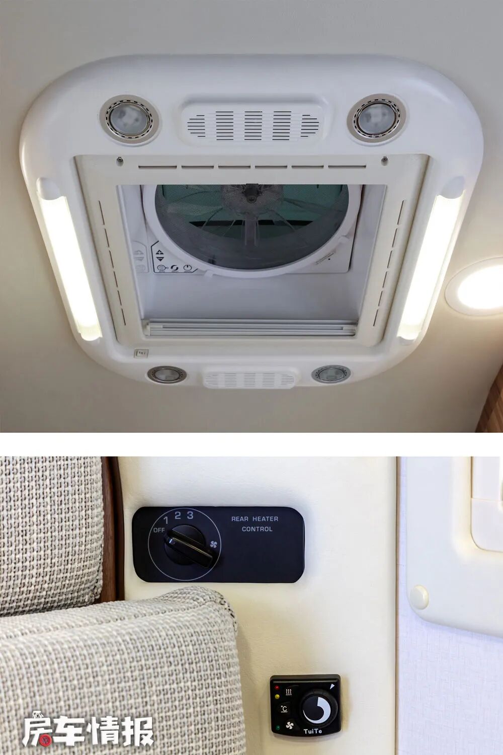 这款房车在电路上搭载了一台12V 150A的交流发动机,提供200Ah的锂电池,并配备了太阳能板。同时在车厢顶部还设置了一个大型的换气扇,保障车内空气流通。