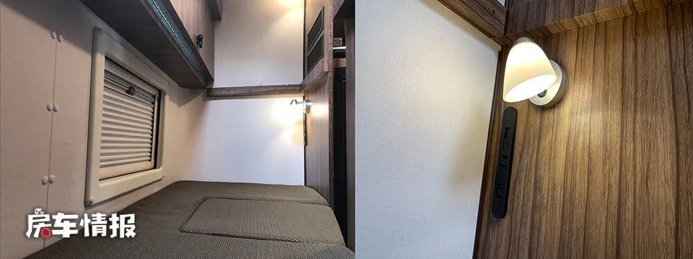 休息区的尾床设计成了上下铺的形式,上下床铺各能容纳一个成年人使用,床头都提供了小夜灯,方便平时使用。