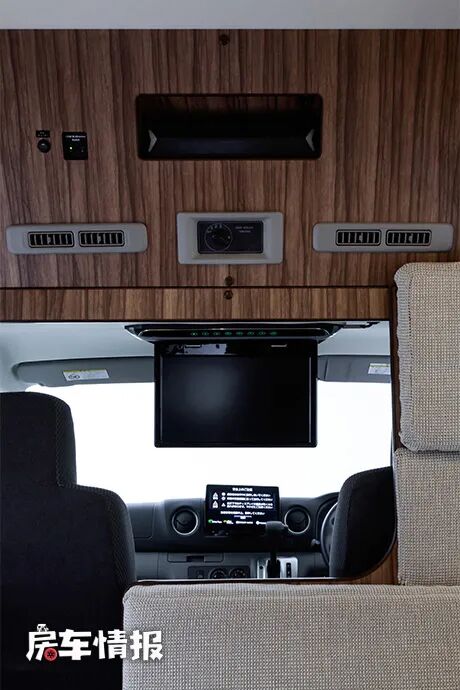 正对乘客门的会客区内提供了两排对坐沙发和一张可升降的餐桌,餐桌距离沙发之间的空间也还不错。驾驶室下方还提供了一台15.6英寸的折叠电视,解决娱乐所需。