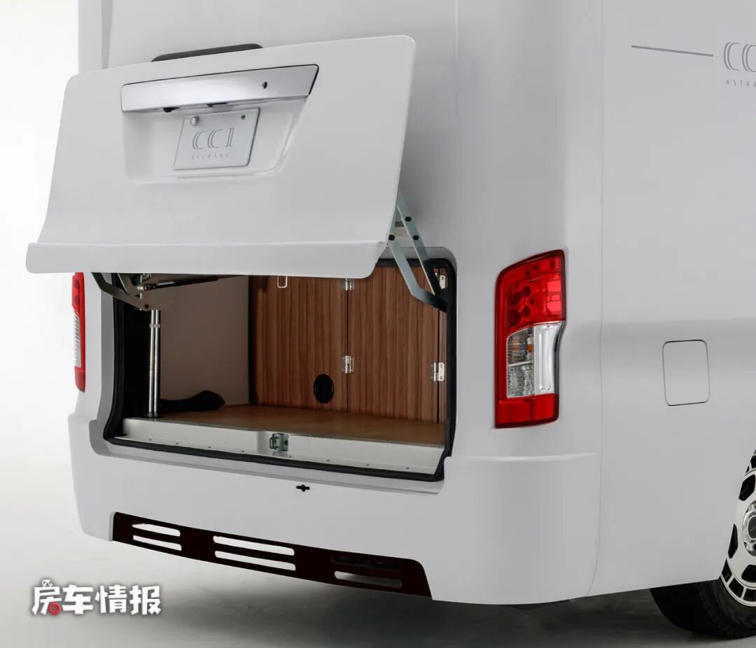 车身外部除去基本的水电接驳口,还在车身尾部提供了一个大尺寸的行李舱,带有自动关闭舱门的功能,而且舱门采用滑动的设计,所以平时即使在狭窄的停车位也可以轻松地拿取行李。