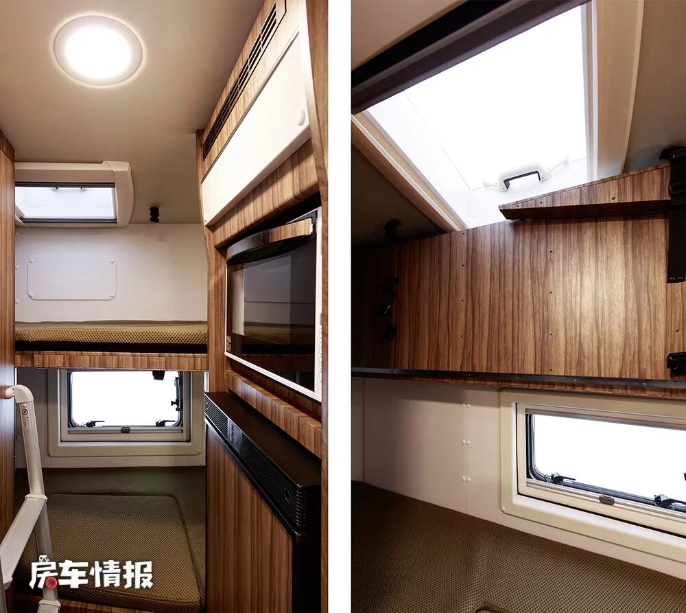 下层床铺的侧面带有外推窗,增加采光量,上层的床铺上方带有天窗,也不会觉得压抑,平时不需要上层床铺的时候,还可以折叠起来,增加下面的使用空间。