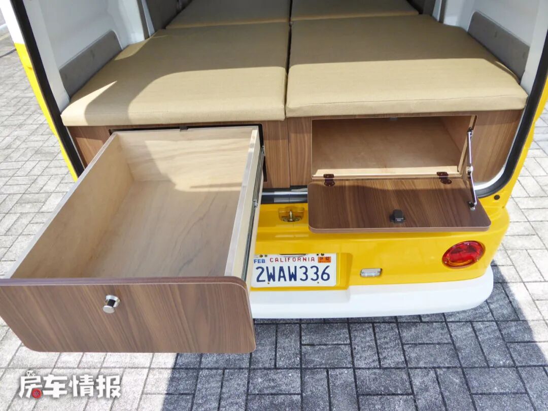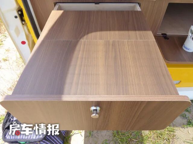 从后尾门可以看到在床板的下方还有两个抽屉,拉出来后一侧可作为储物空间,下翻的柜门也可以作为外置翻板使用,驻车休息的时候放个杯子喝喝茶感觉也非常惬意。