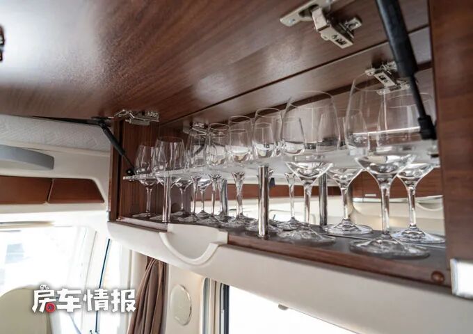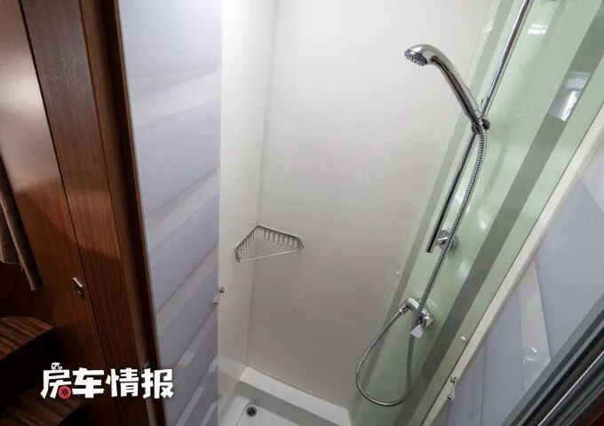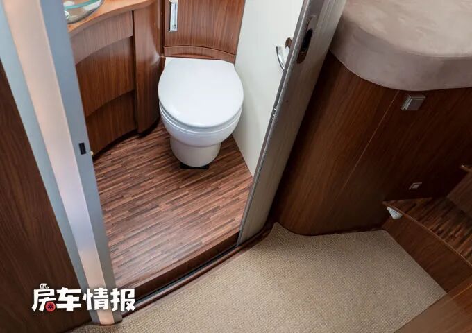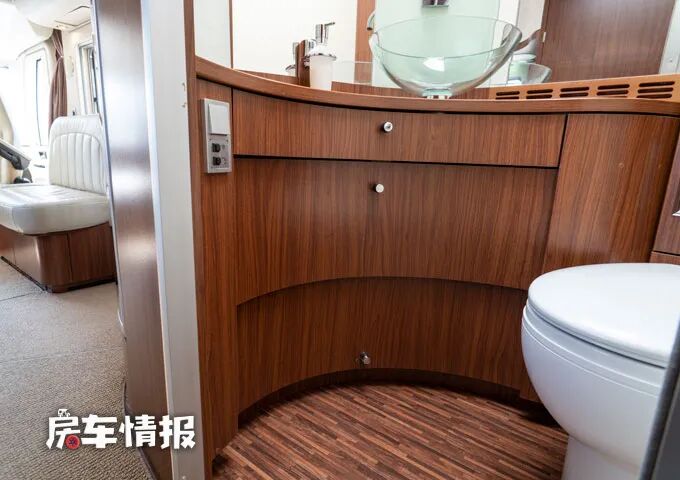 这款房车的卫浴室是干湿分离的,分别设计在了通往休息区的过道中,左手边是一间卫生间,内部带有马桶、梳妆台和置物空间,设计都非常的精致美观,尤其是梳妆台上的玻璃台盆,彰显了与众不同的高级感。