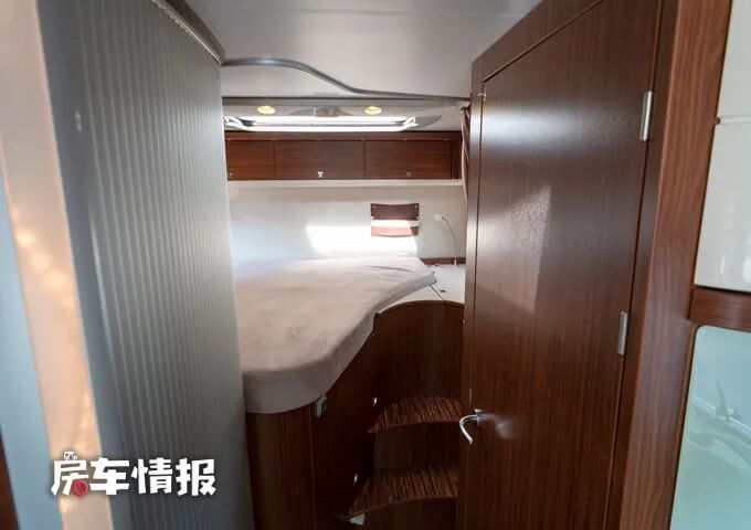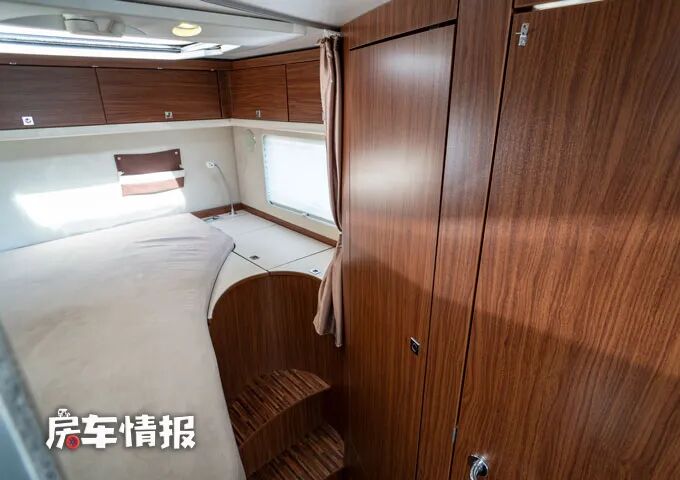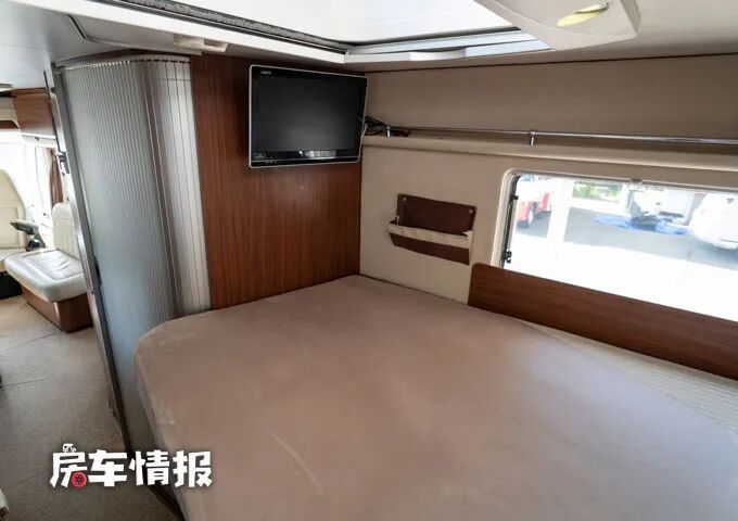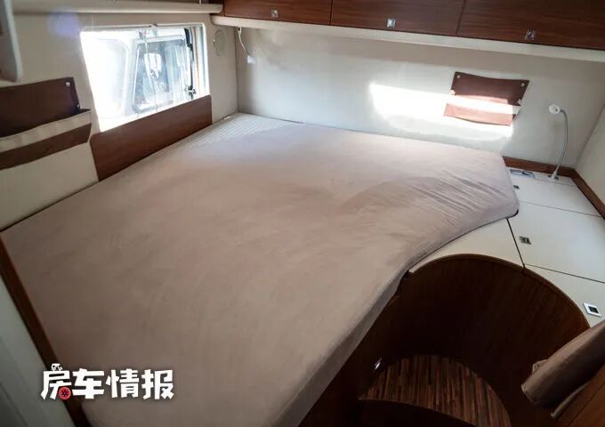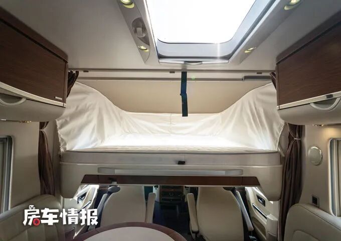 除去尾床之外,在前方驾驶室和会客区中间的上方还提供了一台可升降的双人床,也足够容纳两个成年人休息使用。