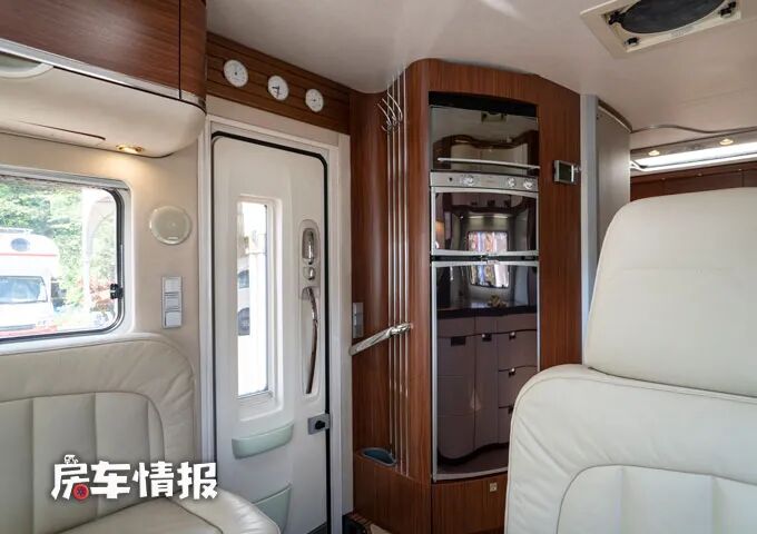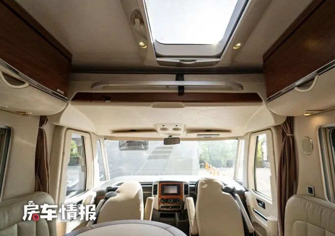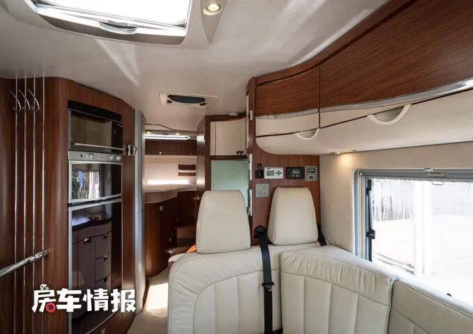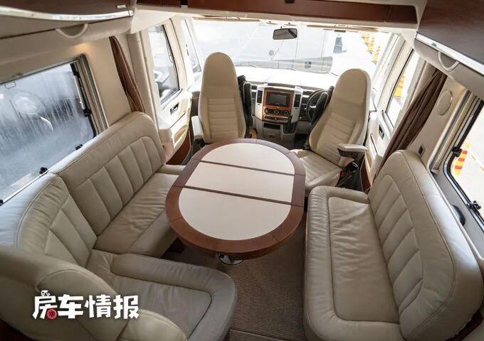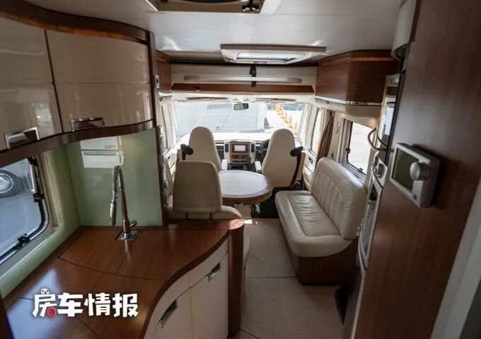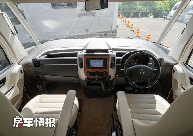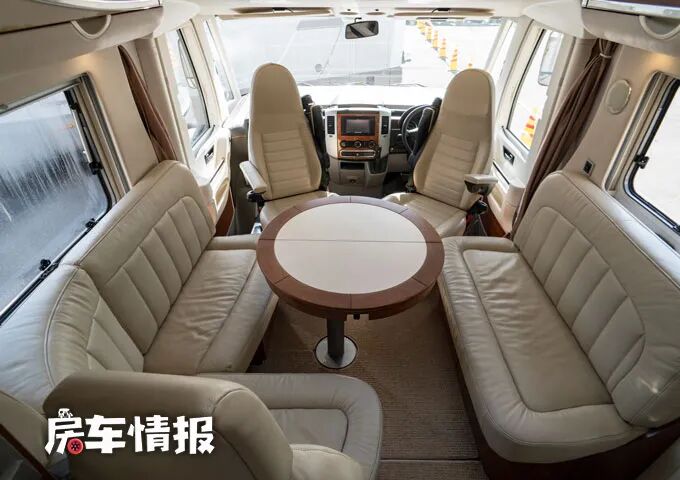 一般我们介绍的右舵车辆,乘客门都在车身左侧开启,但是这款房车将乘客门设置在了车身右侧,不过除了可以选择从乘客门进入车厢内部,也可以从前方的驾驶室直接进去车厢后部,因为驾驶室与后面的生活区是贯通的。