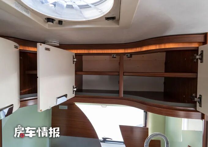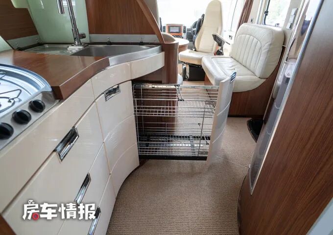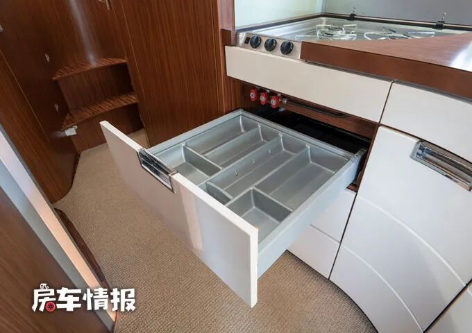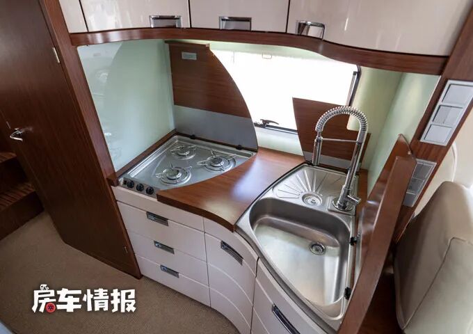 会客区的后方是整车的厨房区,相对来说尺寸也比一般的车型要大出很多,台面上提供了一个三孔燃气灶和一个双槽水盆,操作台上下方分别提供了储物空间。下方的储物抽屉还带有分隔收纳的功能。