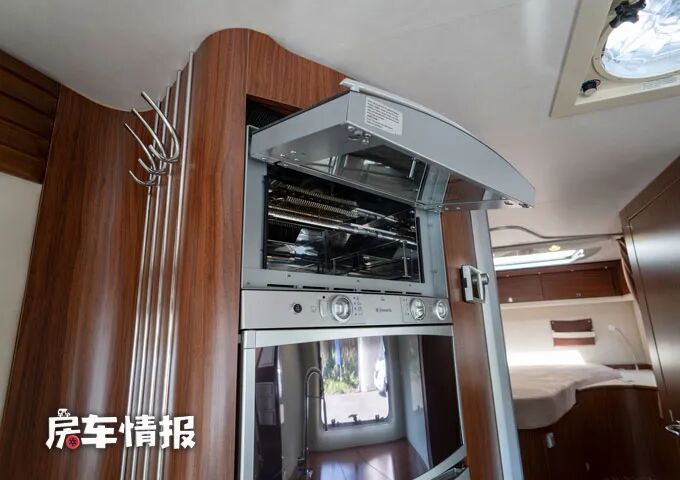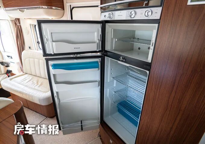临近乘客门后方则镶嵌了一台烤箱和一台175L上下双开门的冰箱。