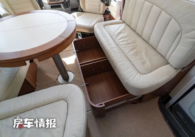 中间是一台圆形的升降餐桌,这个造型在一般房车中并不常见,因为非常的占地方,但是这辆房车的内部空间足够大,所以即使是圆形的餐桌也不觉得拥挤,而且这个餐桌还加入了拓展功能,最终可变成一张椭圆形的餐桌。
