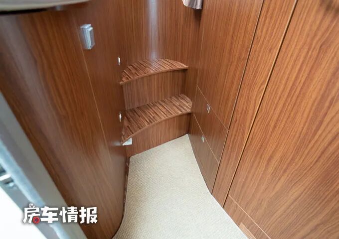 车厢尾部的休息区与前方的驾驶室不在同一个平面,需要登上两层台阶才能上床,顶部还提供了大尺寸的天窗,所以感觉也非常的通透不压抑。