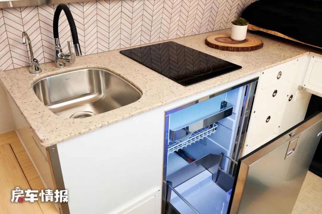 正对乘客门的是一个厨房操作台,台面的尺寸还是挺大的,不仅提供了大尺寸的不锈钢水槽和微波炉,旁边还留有空置的区域可用来切菜准备食材。下方则镶嵌了一台车载冰箱,存放一些易腐坏的食物还是够用的。