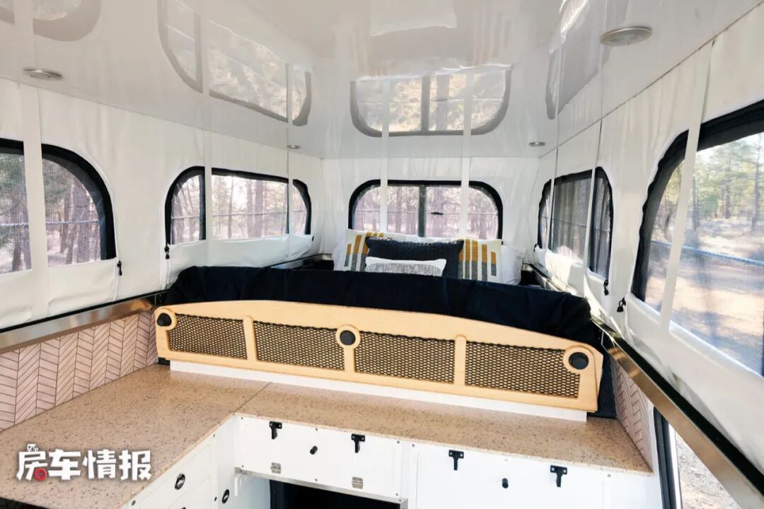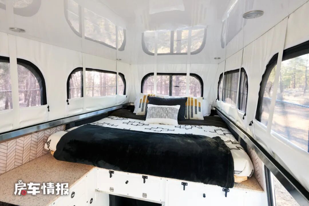休息区在车头的上方,四面共设置了八个大尺寸窗户,使得二层也非常的通透,这些窗户不仅带有防蚊虫屏风和隐私拉帘,还可以通风换气,最重要的是,躺在床上可以从360度欣赏到车外的风光,所提供的双人床也完全可以容纳两个成年人睡觉休息使用,除此之外还提供了电源插座、阅读灯和储物柜,方便平时使用。
