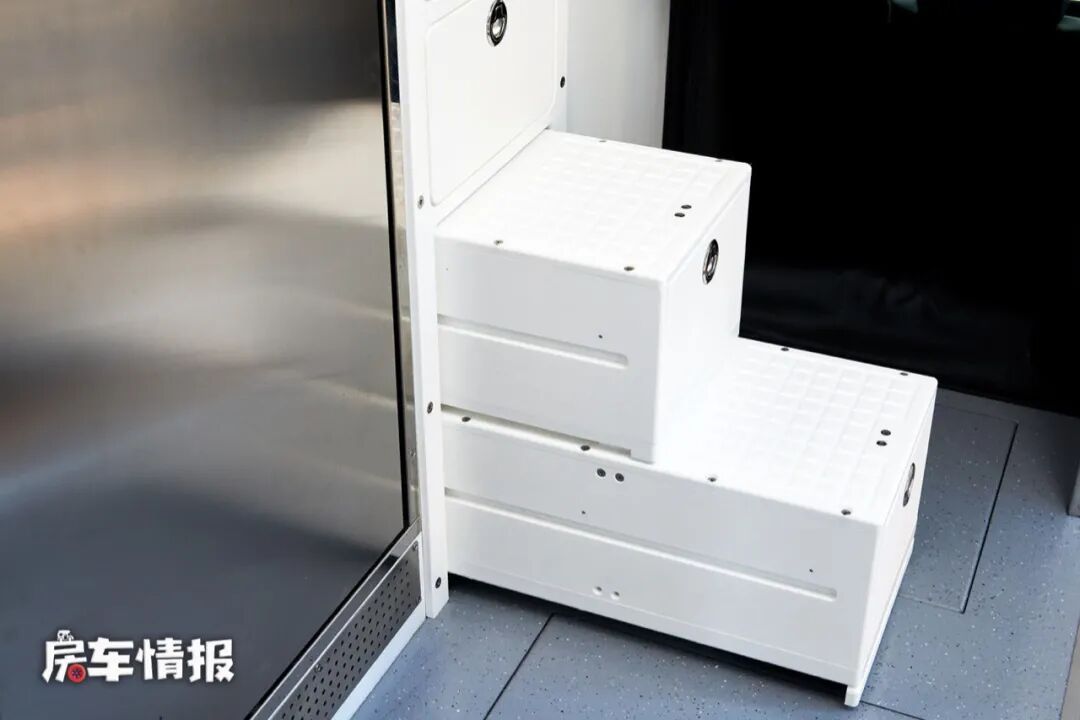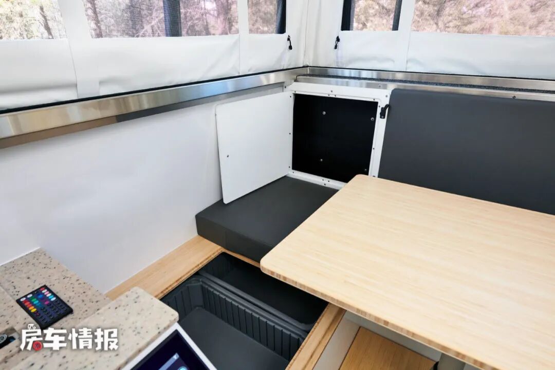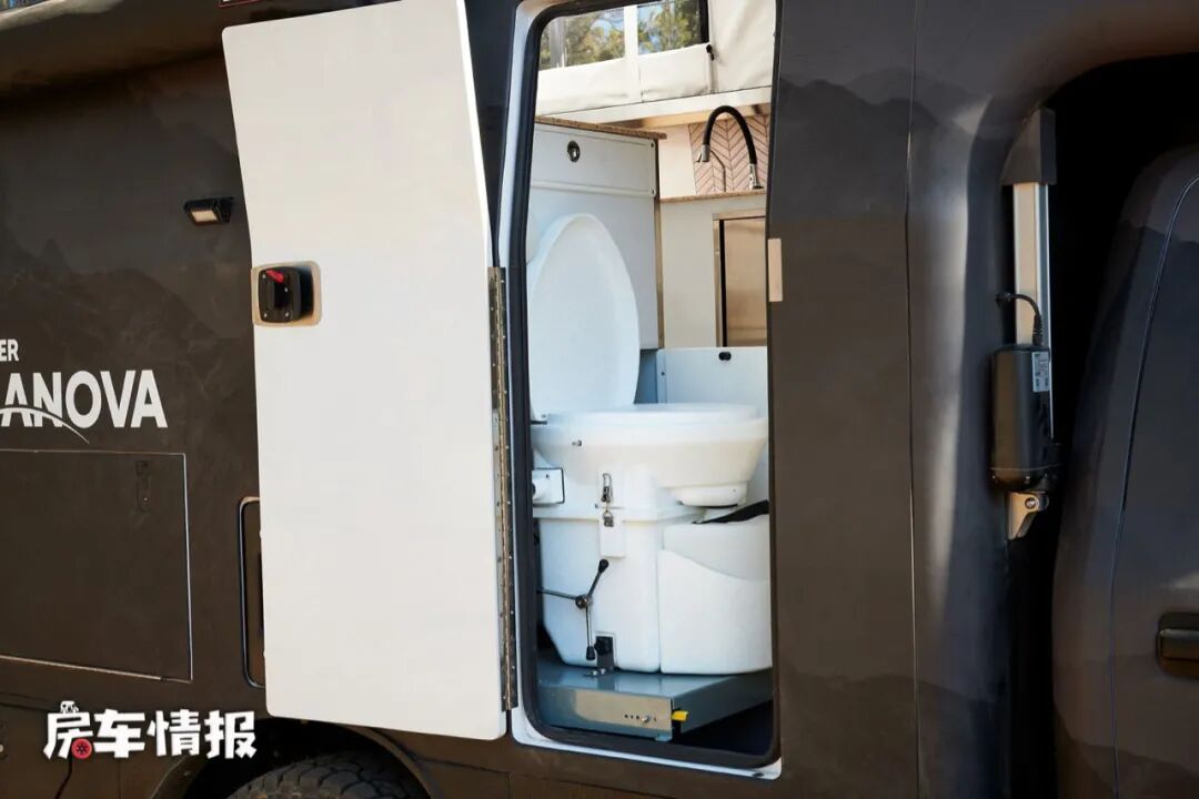 临近乘客门的储物箱下面暗藏了一台可抽拉的马桶,台面上方则是整车的水电控制中心。
