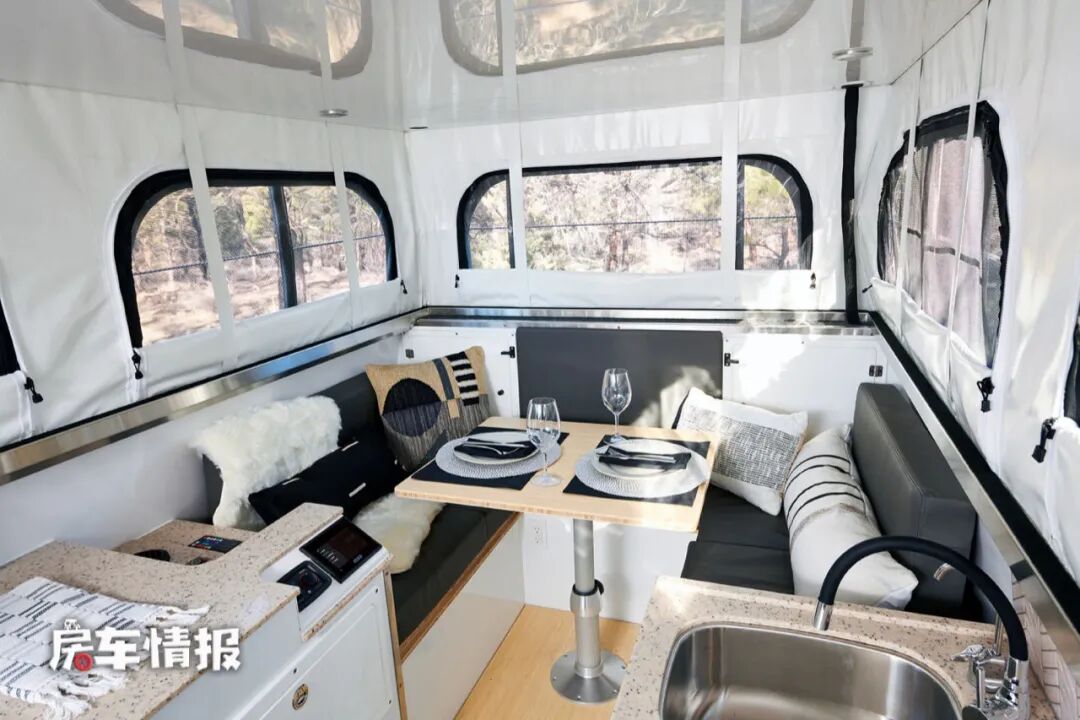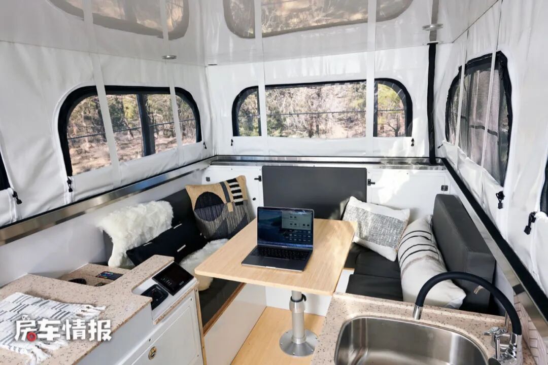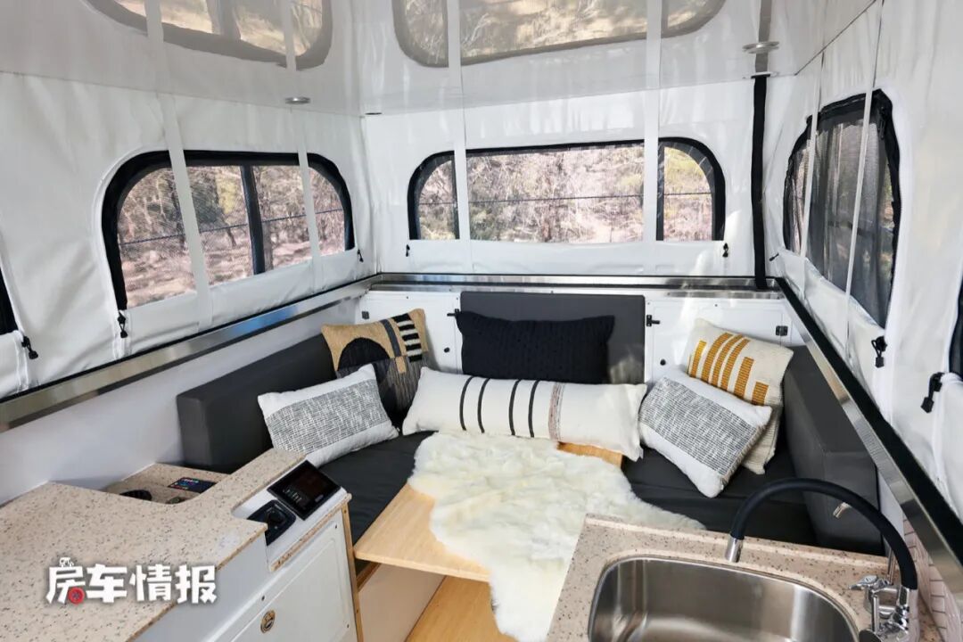 除此之外,这款房车在顶部还加入了升顶机构,与往常我们所见的不同,升顶机构并不是斜坡式的,而是直上直下式的,从而进一步加大内部的使用空间,就像一间移动的LOFT。