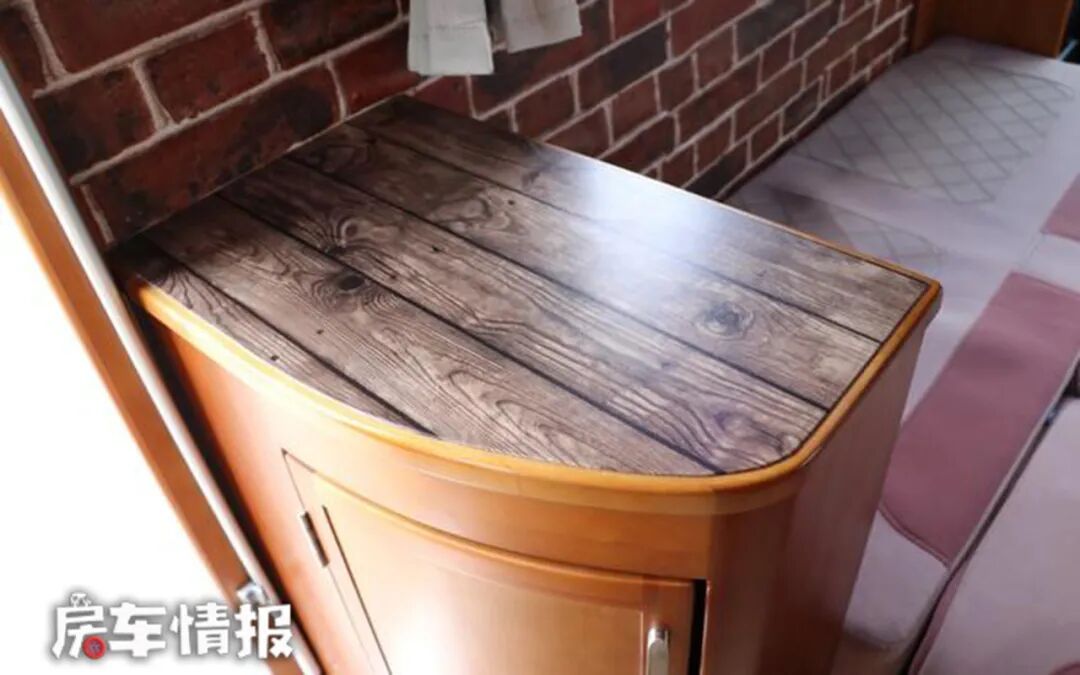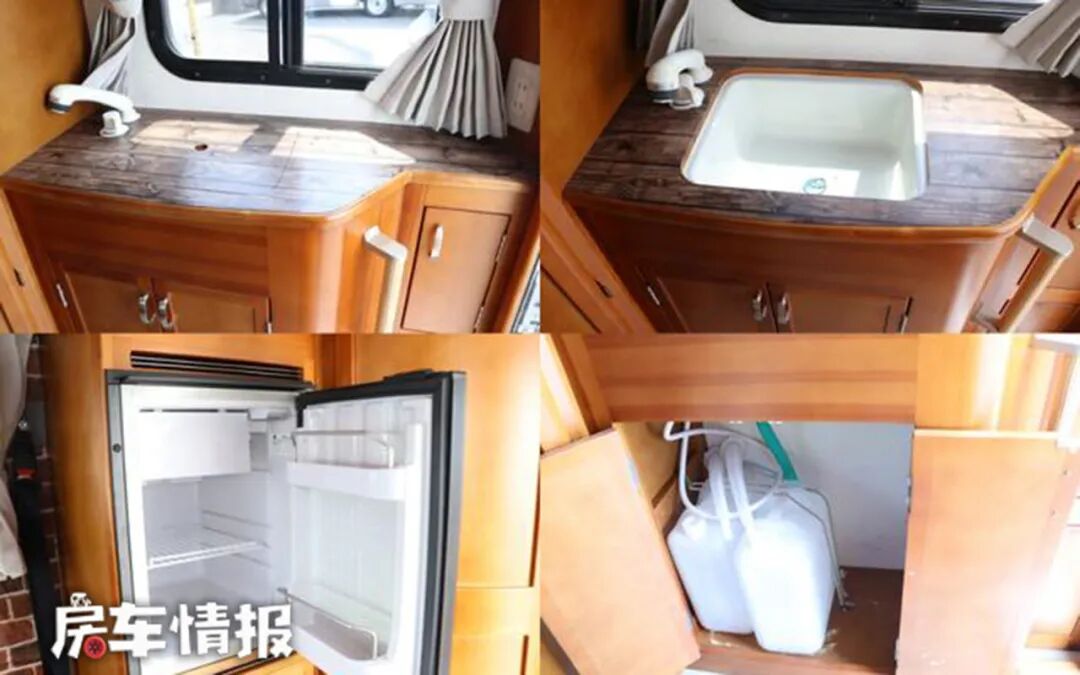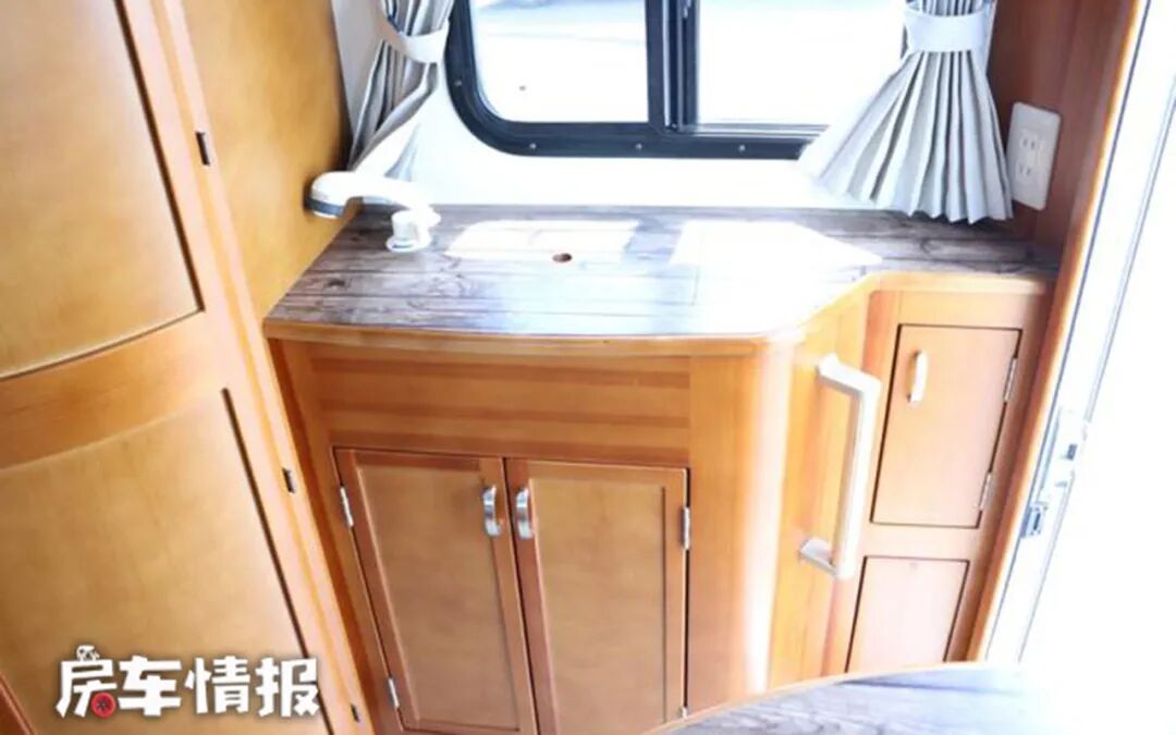 乘客门右手边就是全车的厨房操作台,提供了带盖的洗菜池下方则是储物空间,侧面壁板上还带有电源插座,可以外接便携式电磁炉,满足开火做饭的需求。