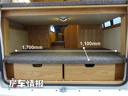 打开后尾门可以看到,在下床的下面还有储物抽屉,可以存放一些床上用品,平时白天不需要床铺的时候,也可以将床板收起,用来存放大件的行李。
