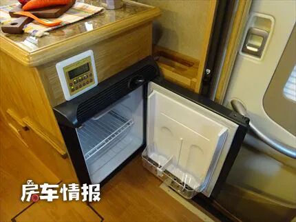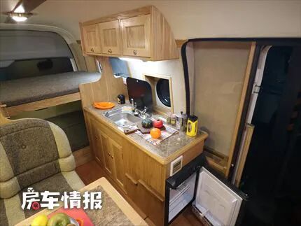 乘客门后方是厨房操作台,台面面积很宽敞,提供了带盖的不锈钢水槽以及便携式的电磁炉,橱柜侧面还暗藏了一台40L的冰箱,平时放一些易腐烂的食物还是足够用的。