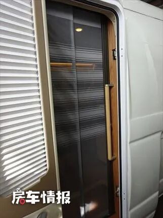 全车的玻璃窗也被改造成为了丙烯酸窗户,并在整体的框架中加入了大量的隔热材料,使整车的保温效果更强,同时也提高了车身刚度。刚才之前也有提过,这款房车采用了平开门的设计,同时配备了滑动纱门,防止虫蚊进入的同时也能够通风透气。