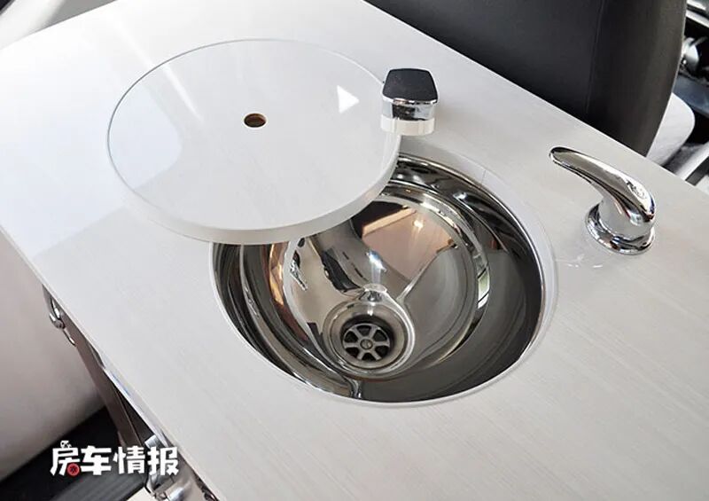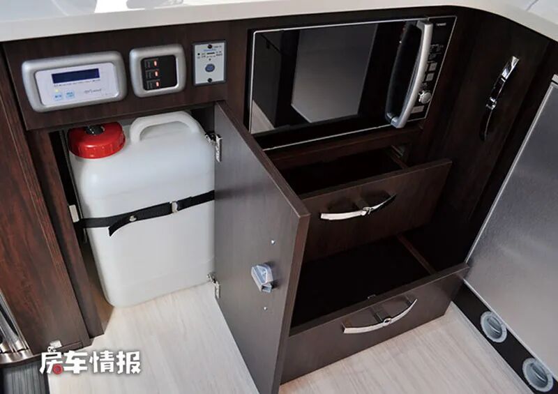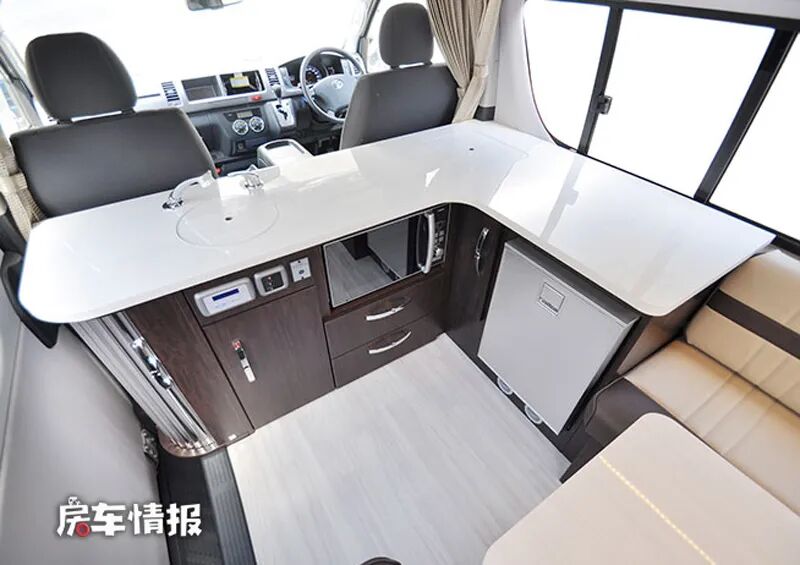 驾驶室后排是一排L型的橱柜,台面上包含了一台小型的带盖水槽,台面下方提供了一台微波炉和一台49L的车载冰箱。