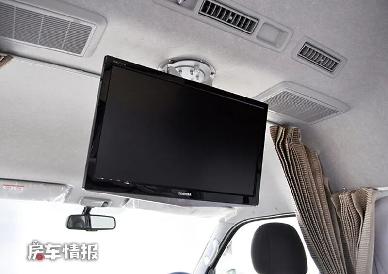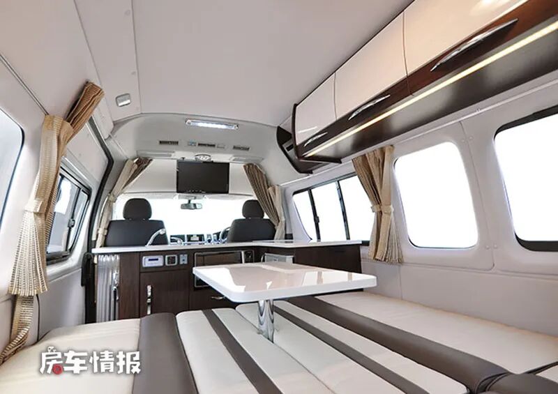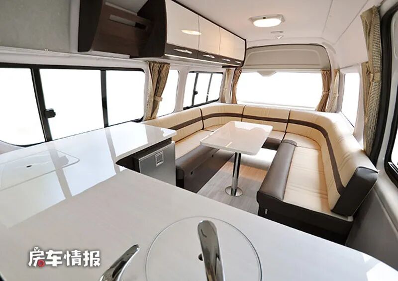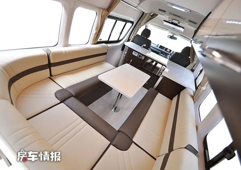 车厢后部是一圈U型的大尺寸沙发,平时可以乘坐8个人,沙发座椅全部采用皮质软包的工艺,乘坐起来也比较的舒适。座椅和中间升降餐桌的距离也比较宽松,不会觉得压腿。另外在前方的驾驶室顶部还提供了一台液晶电视。