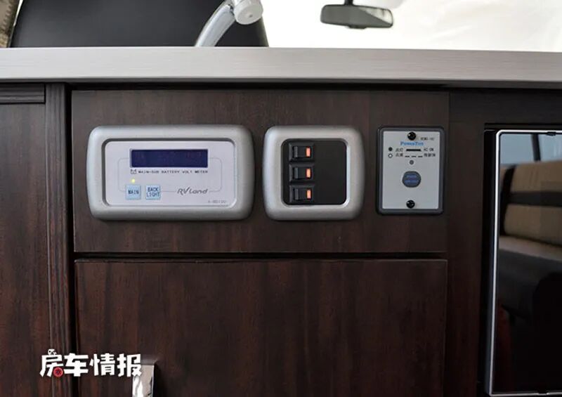 整车的电水路控制面板在进门处橱柜台面的下方,在这里可以随时观察整车的水电使用情况,并且始终显示子电池的电压,因此可以在控制电压的同时放心使用设备,也防止忘记关灯等,即使忘记关闭电源或使用过多的电量,也不必担心,因为全车配备的子电池具有电池保护装置,充电效率良好,并且可以长时间使用。