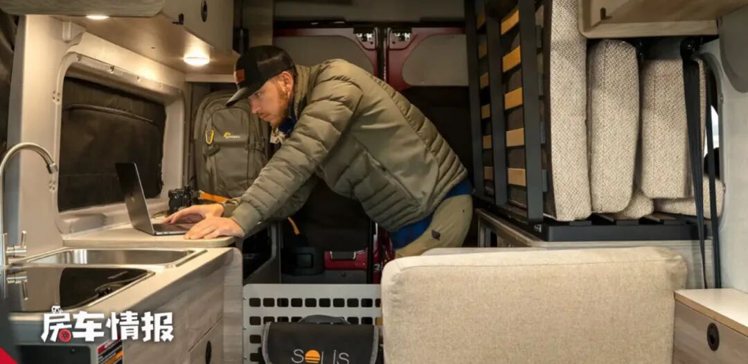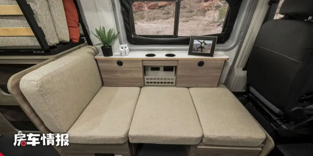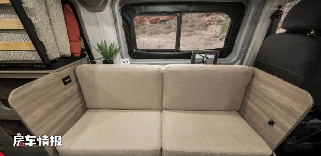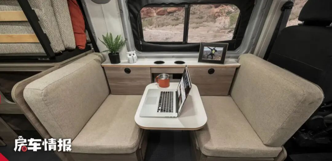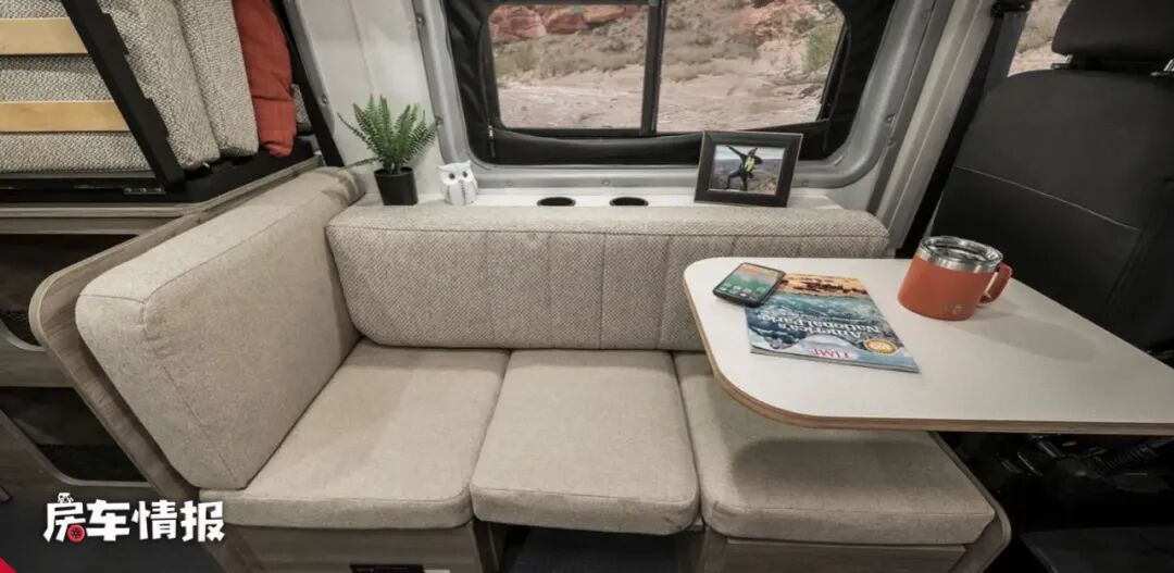 也可以将沙发组合成一个临时的沙发坐塌,把餐桌移动到驾驶室座椅的后方,这样的布局更适合一个人的休闲时光。