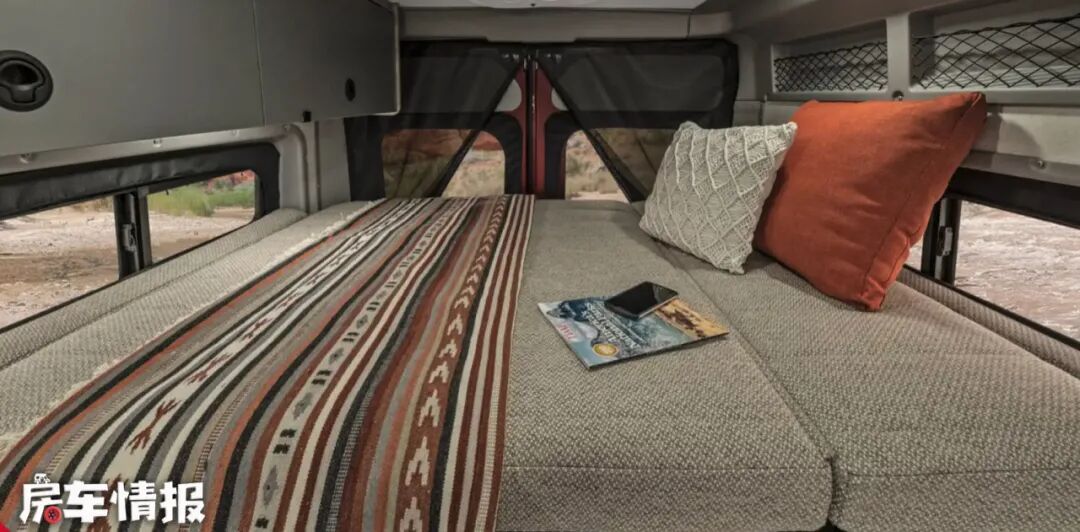 最后是尾部的横置双人床,平时晚上休息的时候为打开状态,尺寸为1910mm*1320mm,完全可以容纳两个成年人使用。