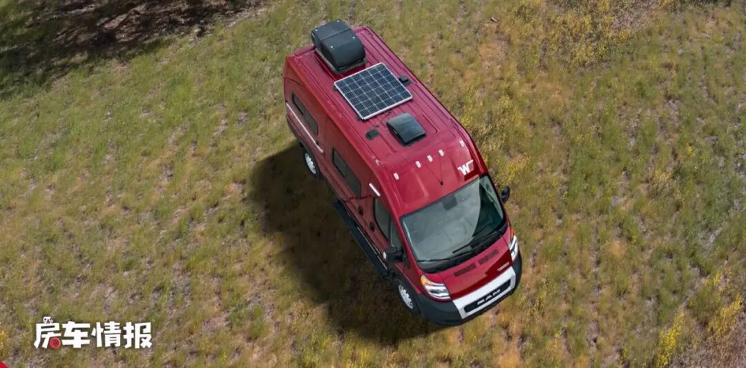 全车是以酒红色为主色调,车身外配置也和普通的B型车相似,只提供了简单的水电接驳功能,在车顶可以看到凸起的顶置空调以及太阳能板。