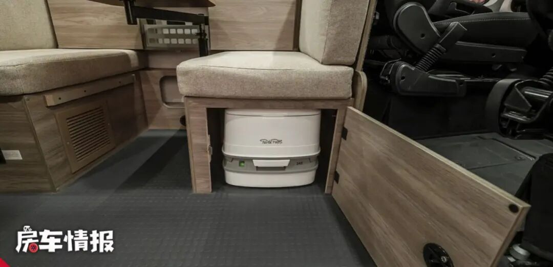 在前排沙发座椅的下面还暗藏了一台便携式马桶,因为整辆车并不具备单独的卫生间,所以便携式马桶也可以临时应急使用。