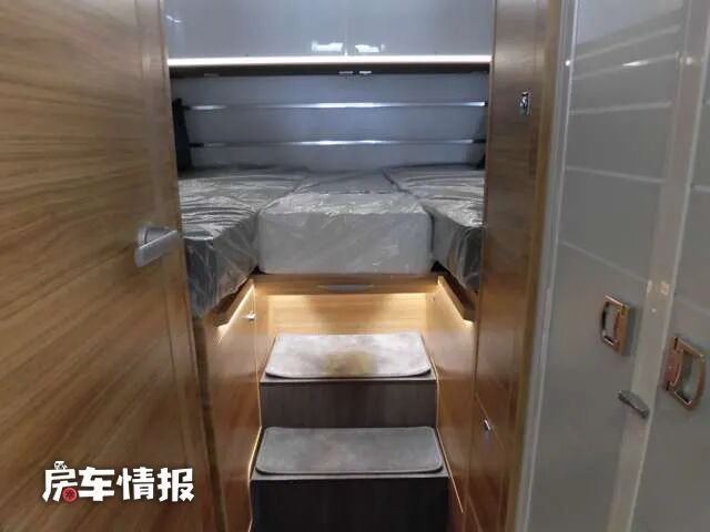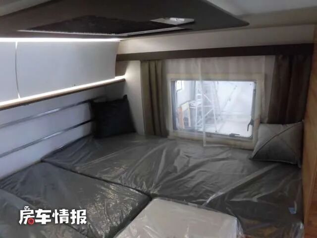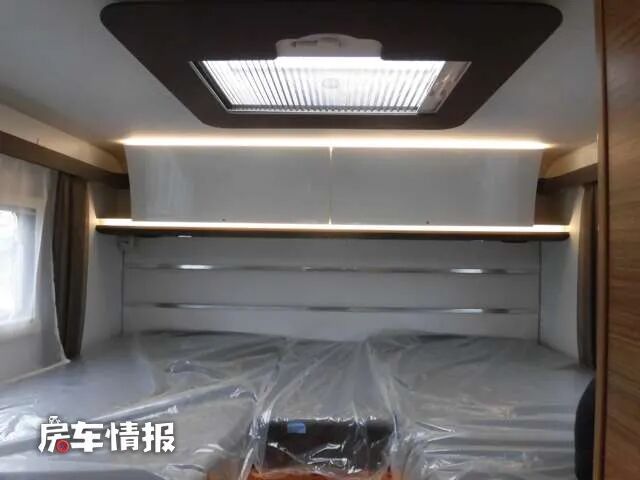 在驾驶室上方的区域还有一张升降双人床,尺寸为1900mm*1500,足够两个成年人在这里睡觉,另外顶部带有天窗,所以当升降床降下时,也不会觉得上方的空间昏暗。