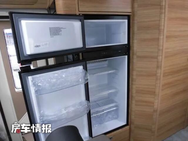 与厨房区相对的,临近乘客门处的是一台167L的上下双开门冰箱。