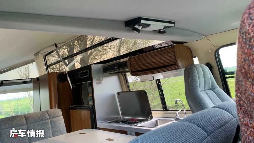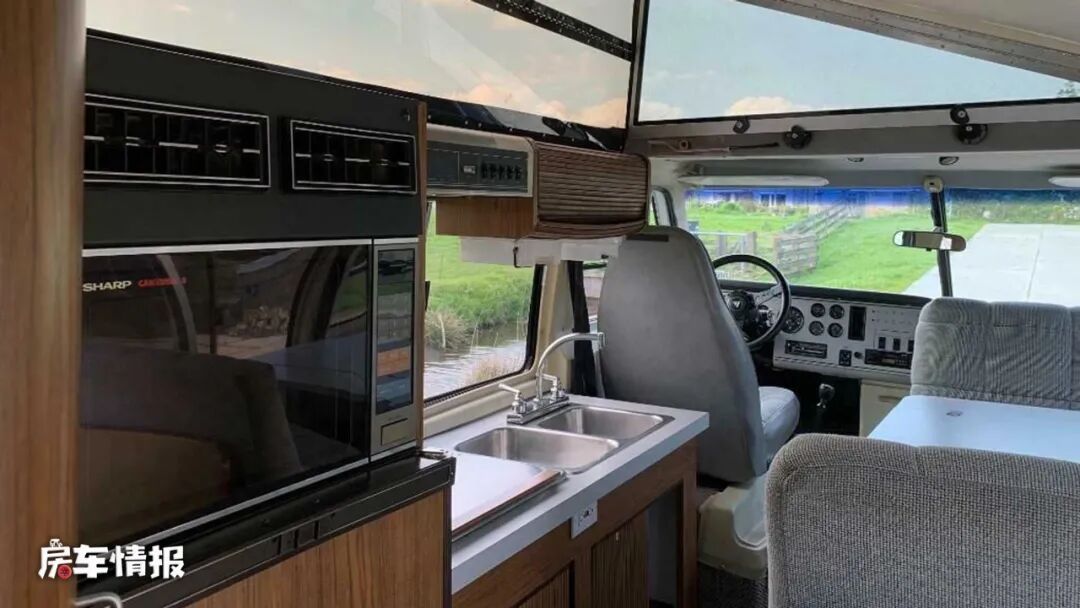 主驾驶座椅后方的厨房区更像是美式厨房的感觉,配置也非常的丰富,不仅带有双槽的水盆。还提供了烤箱、电磁炉、微波炉和冰箱等厨用电器,甚至比当下的房车配置还要齐全,一点儿也不过时。